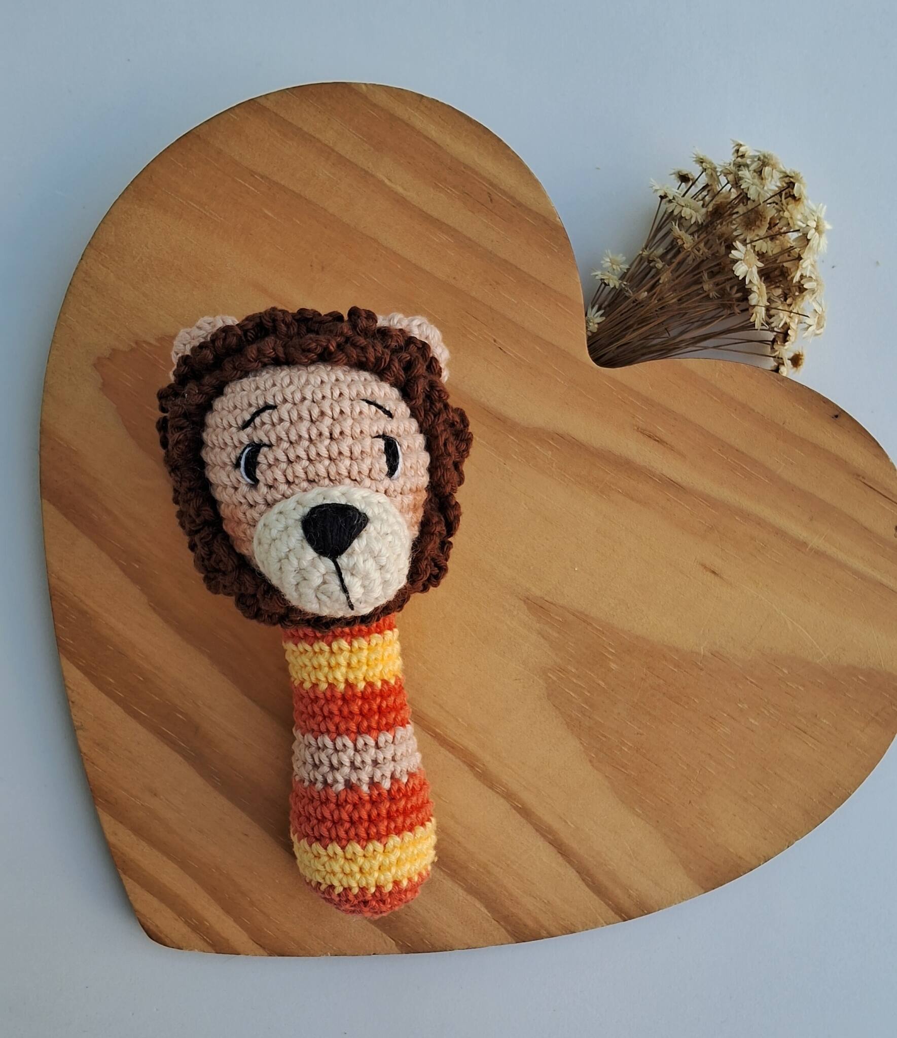 Chocalho Leão, presente ideal para os bebês, desde o nascimento, feito com linhas 100 % algodão ou mista e enchimento com fibra siliconada. Pode ter alteração de tamanho devido a confecção manual.